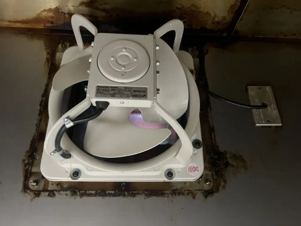 店内の一部で空気が滞るとの相談があり、換気扇の取り付け部を点検しました。長年の使用によりわずかに傾きが生じていたため、周囲を傷つけないよう急がず撤去を実施。新しい換気扇は向きと高さを丁寧に調整し、空気の流れがスムーズに戻ったことを確認して施工完了です。